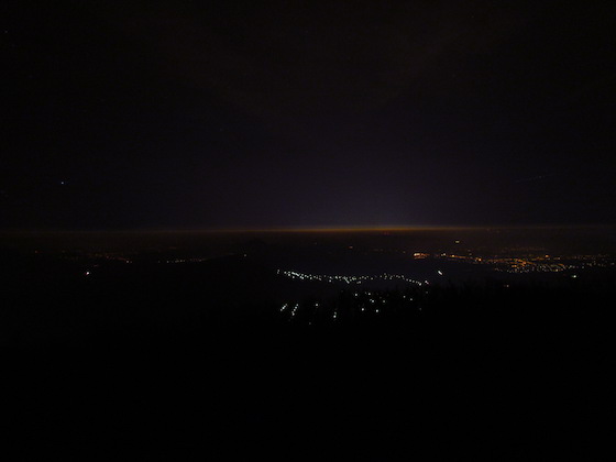 Mérésünket 2015. november 3-án, kedd délután 17 órakor a 864 méter magas Nagy Hideg-hegyen kezdtük. A naplemente fényeiben jól látszott a hidegpárna teteje, élesen elkülönülve a felette rétegződő melegebb és szárazabb légtömegtől. A hidegpárna felett átlagosan 6628 részecske szennyezte a levegőt köbcentiméterenként.