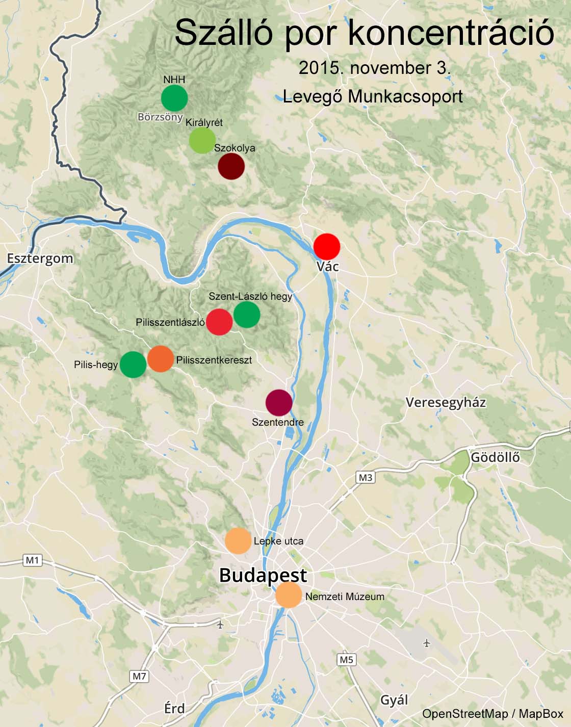 A Duna völgyében, Vácon végeztük a következő mérést a Schuszter Konstantin téren. Vác ugyan lényegesen nagyobb település, mint Szokolya, de csak átlagosan 21035 részecskét észlelt a műszer. Következő állomásunk a Duna túlpartján, Pilisszentlászló előtt a Hegytető parkolóban volt. Itt távol a településektől, 452 méter magasan szintén tisztább levegőt mértünk 6043 részecskével. Ezt a „jó” levegőt katasztrofálisan lerontja Pilisszentlászlón a fűtés, átlagosan 24021 részecskét mért a részecskeszámláló. A hegyről legurulva Szentendrén is mértünk, a Vasúti villasoron, itt 26172 nanorészecske rontotta a levegőt. Ismét nekivágtunk a hegyeknek, Pilisszentkereszten is éreztette magát a fatüzelés füstje, 18433 részecskét produkálva átlagosan.