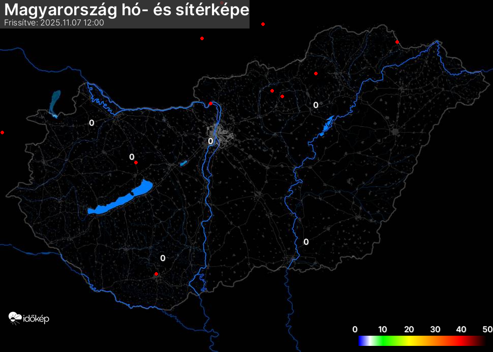 Hótérképünkön hazánk síterepei mellett észlelőink által jelzett hóvastagság adatok is