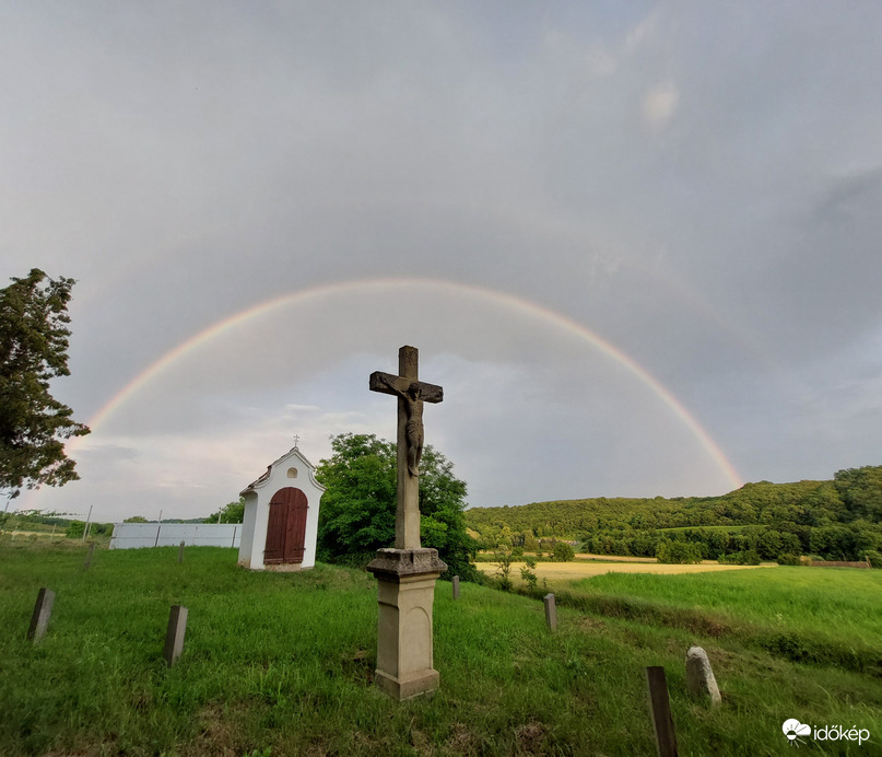 Keletre elhaladó zápor szivárványal kísérve.