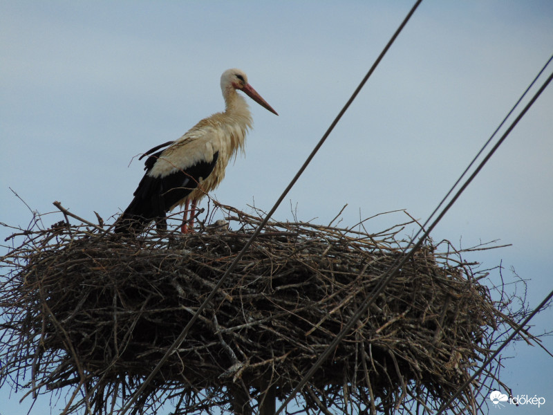 Veszprémiek gólyája,picit csapzottan de a miénk.Az egyik kicsi már látszik a lábánál.
