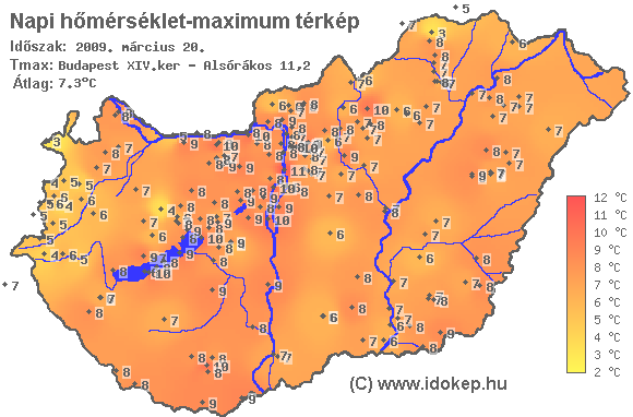A maximumtérképen kirajzolódik az adott napon mért legmagasabb hőmérsékletek térbeli eloszlása. Az adott nap hőmérsékleti maximumát télen reggel és este 7 óra, nyáron reggel és este 8 óra között mért legmagasabb értékkel adjuk meg. Adatbeküldés: következő nap reggel 4 óráig.