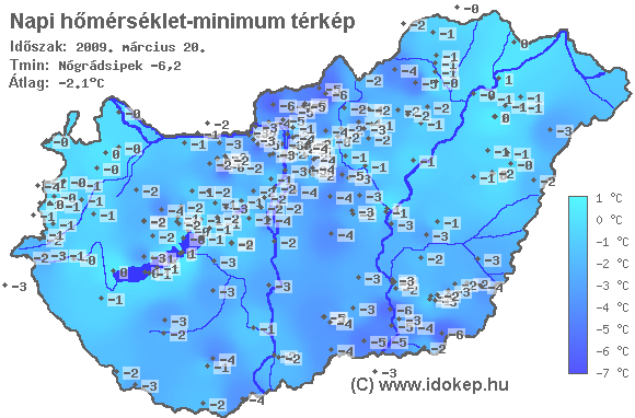 A minimumtérképen kirajzolódik az adott éjszaka mért legalacsonyabb hőmérsékletek térbeli eloszlása. Az adott nap hőmérsékleti minimumát télen előző este 7 és aznap reggel 7 óra, nyáron előző este 8 és aznap reggel 8 óra között mért legalacsonyabb értékkel adjuk meg. Adatbeküldés: aznap délután 4 óráig.
