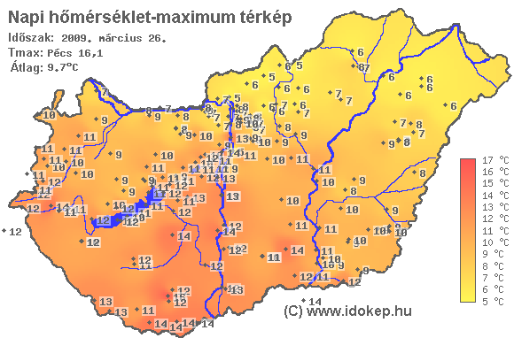 A maximumtérképen kirajzolódik az adott napon mért legmagasabb hőmérsékletek térbeli eloszlása. Az adott nap hőmérsékleti maximumát télen reggel és este 7 óra, nyáron reggel és este 8 óra között mért legmagasabb értékkel adjuk meg. Adatbeküldés: következő nap reggel 4 óráig.