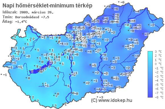 A minimumtérképen kirajzolódik az adott éjszaka mért legalacsonyabb hőmérsékletek térbeli eloszlása. Az adott nap hőmérsékleti minimumát télen előző este 7 és aznap reggel 7 óra, nyáron előző este 8 és aznap reggel 8 óra között mért legalacsonyabb értékkel adjuk meg. Adatbeküldés: aznap délután 4 óráig.