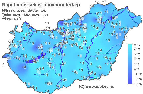 A minimumtérképen kirajzolódik az adott éjszaka mért legalacsonyabb hőmérsékletek térbeli eloszlása. Az adott nap hőmérsékleti minimumát télen előző este 7 és aznap reggel 7 óra, nyáron előző este 8 és aznap reggel 8 óra között mért legalacsonyabb értékkel adjuk meg. Adatbeküldés: aznap délután 4 óráig.
