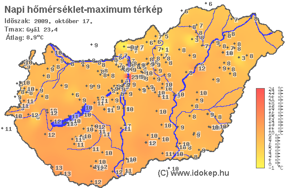 A maximumtérképen kirajzolódik az adott napon mért legmagasabb hőmérsékletek térbeli eloszlása. Az adott nap hőmérsékleti maximumát télen reggel és este 7 óra, nyáron reggel és este 8 óra között mért legmagasabb értékkel adjuk meg. Adatbeküldés: következő nap reggel 4 óráig.