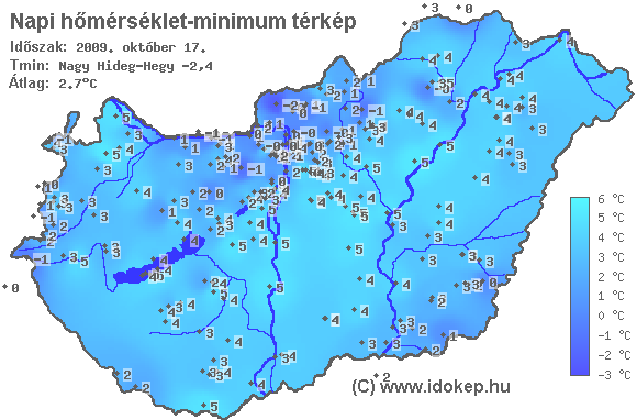 A minimumtérképen kirajzolódik az adott éjszaka mért legalacsonyabb hőmérsékletek térbeli eloszlása. Az adott nap hőmérsékleti minimumát télen előző este 7 és aznap reggel 7 óra, nyáron előző este 8 és aznap reggel 8 óra között mért legalacsonyabb értékkel adjuk meg. Adatbeküldés: aznap délután 4 óráig.