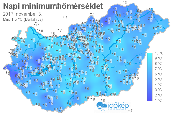 A minimumtérképen kirajzolódik az adott éjszaka mért legalacsonyabb hőmérsékletek térbeli eloszlása. Az adott nap hőmérsékleti minimumát télen előző este 7 és aznap reggel 7 óra, nyáron előző este 8 és aznap reggel 8 óra között mért legalacsonyabb értékkel adjuk meg. Adatbeküldés: aznap délután 4 óráig.