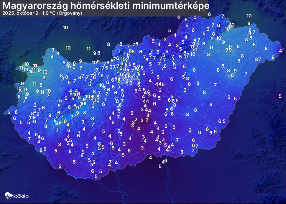 A minimumtérképen kirajzolódik az adott éjszaka mért legalacsonyabb hőmérsékletek térbeli eloszlása. Az adott nap hőmérsékleti minimumát télen előző este 7 és aznap reggel 7 óra, nyáron előző este 8 és aznap reggel 8 óra között mért legalacsonyabb értékkel adjuk meg. Adatbeküldés: aznap délután 4 óráig.