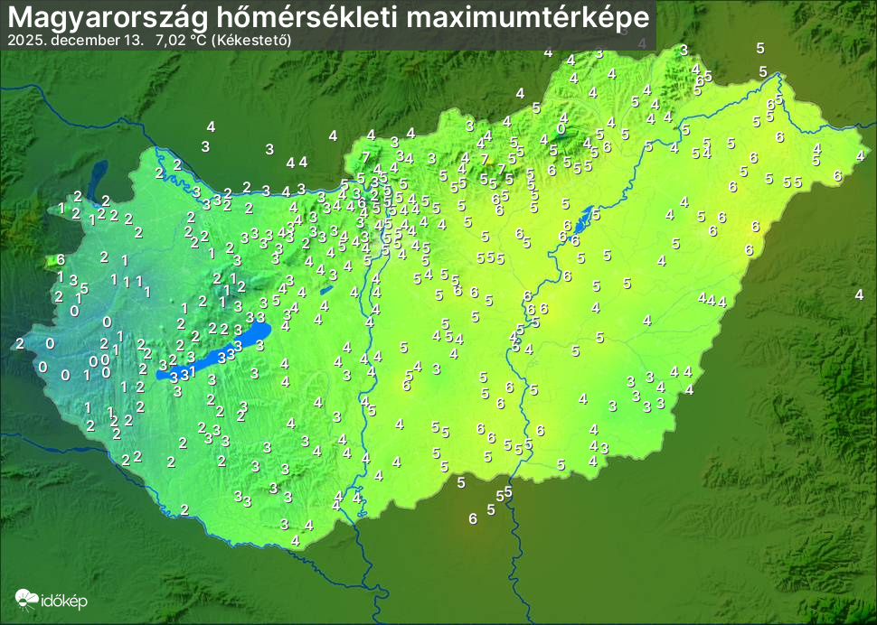A maximumtérképen kirajzolódik az adott napon mért legmagasabb hőmérsékletek térbeli eloszlása. Az adott nap hőmérsékleti maximumát télen reggel és este 7 óra, nyáron reggel és este 8 óra között mért legmagasabb értékkel adjuk meg. Adatbeküldés: következő nap reggel 4 óráig.