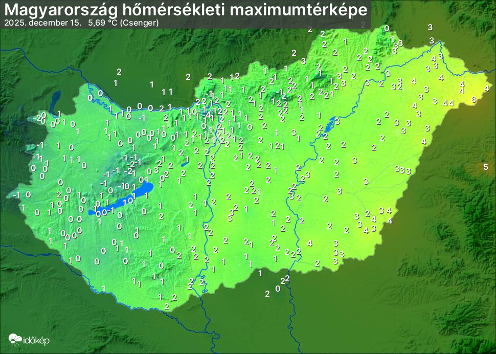 A maximumtérképen kirajzolódik az adott napon mért legmagasabb hőmérsékletek térbeli eloszlása. Az adott nap hőmérsékleti maximumát télen reggel és este 7 óra, nyáron reggel és este 8 óra között mért legmagasabb értékkel adjuk meg. Adatbeküldés: következő nap reggel 4 óráig.