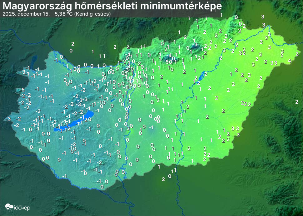 A minimumtérképen kirajzolódik az adott éjszaka mért legalacsonyabb hőmérsékletek térbeli eloszlása. Az adott nap hőmérsékleti minimumát télen előző este 7 és aznap reggel 7 óra, nyáron előző este 8 és aznap reggel 8 óra között mért legalacsonyabb értékkel adjuk meg. Adatbeküldés: aznap délután 4 óráig.