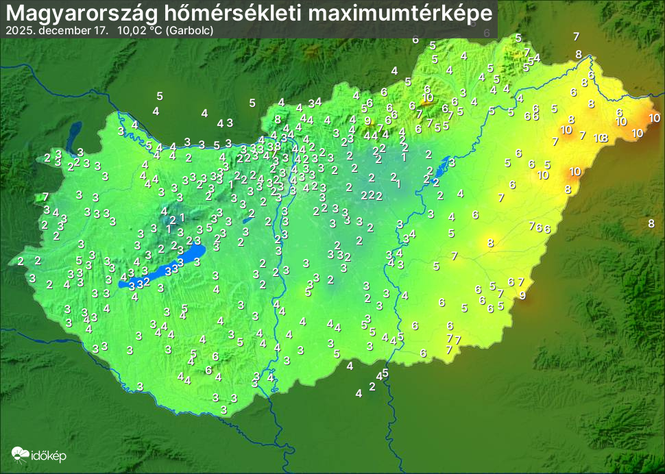 A maximumtérképen kirajzolódik az adott napon mért legmagasabb hőmérsékletek térbeli eloszlása. Az adott nap hőmérsékleti maximumát télen reggel és este 7 óra, nyáron reggel és este 8 óra között mért legmagasabb értékkel adjuk meg. Adatbeküldés: következő nap reggel 4 óráig.