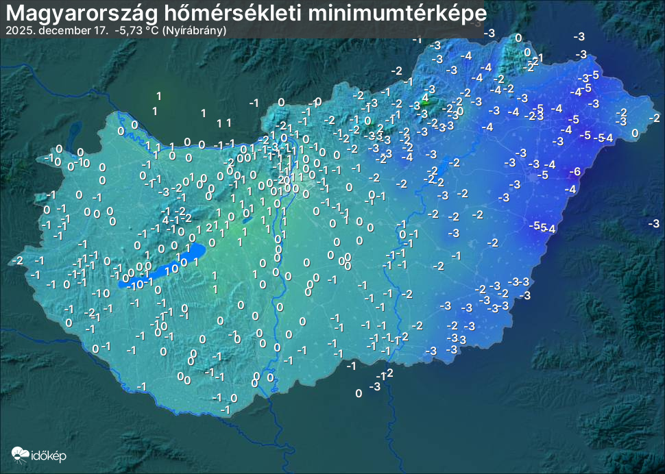 A minimumtérképen kirajzolódik az adott éjszaka mért legalacsonyabb hőmérsékletek térbeli eloszlása. Az adott nap hőmérsékleti minimumát télen előző este 7 és aznap reggel 7 óra, nyáron előző este 8 és aznap reggel 8 óra között mért legalacsonyabb értékkel adjuk meg. Adatbeküldés: aznap délután 4 óráig.