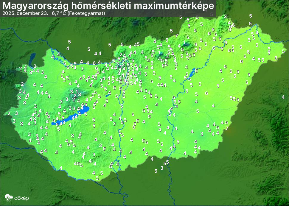 A maximumtérképen kirajzolódik az adott napon mért legmagasabb hőmérsékletek térbeli eloszlása. Az adott nap hőmérsékleti maximumát télen reggel és este 7 óra, nyáron reggel és este 8 óra között mért legmagasabb értékkel adjuk meg. Adatbeküldés: következő nap reggel 4 óráig.