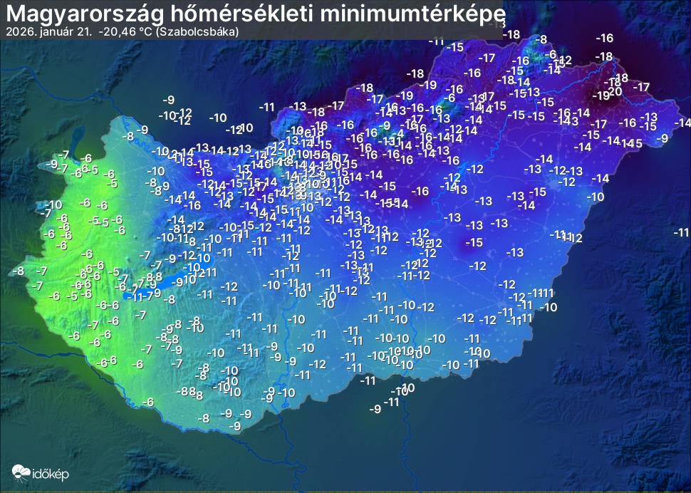 A minimumtérképen kirajzolódik az adott éjszaka mért legalacsonyabb hőmérsékletek térbeli eloszlása. Az adott nap hőmérsékleti minimumát télen előző este 7 és aznap reggel 7 óra, nyáron előző este 8 és aznap reggel 8 óra között mért legalacsonyabb értékkel adjuk meg. Adatbeküldés: aznap délután 4 óráig.
