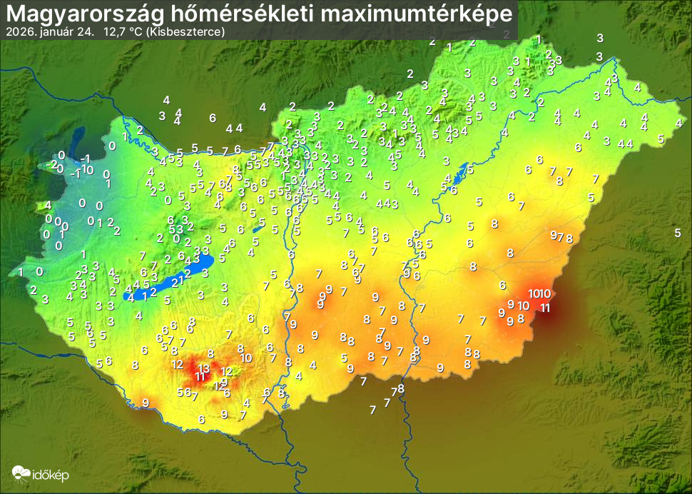 A maximumtérképen kirajzolódik az adott napon mért legmagasabb hőmérsékletek térbeli eloszlása. Az adott nap hőmérsékleti maximumát télen reggel és este 7 óra, nyáron reggel és este 8 óra között mért legmagasabb értékkel adjuk meg. Adatbeküldés: következő nap reggel 4 óráig.