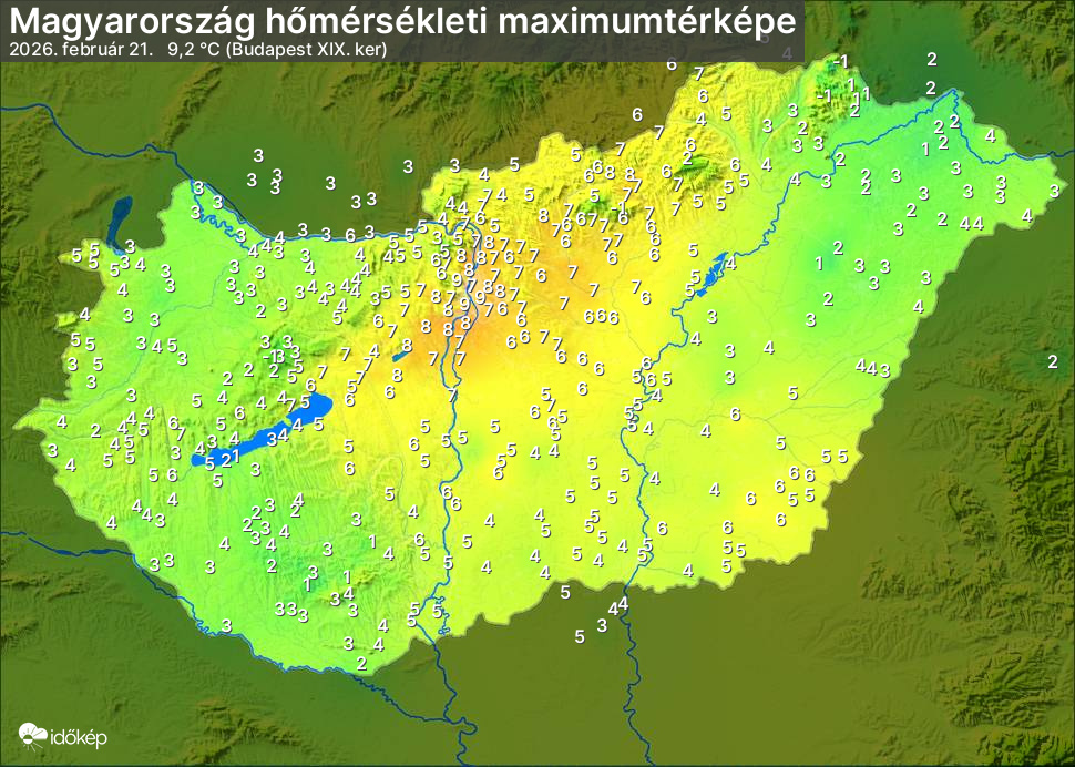 A maximumtérképen kirajzolódik az adott napon mért legmagasabb hőmérsékletek térbeli eloszlása. Az adott nap hőmérsékleti maximumát télen reggel és este 7 óra, nyáron reggel és este 8 óra között mért legmagasabb értékkel adjuk meg. Adatbeküldés: következő nap reggel 4 óráig.
