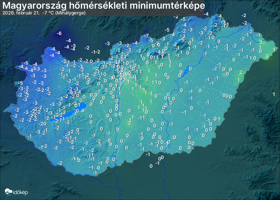 A minimumtérképen kirajzolódik az adott éjszaka mért legalacsonyabb hőmérsékletek térbeli eloszlása. Az adott nap hőmérsékleti minimumát télen előző este 7 és aznap reggel 7 óra, nyáron előző este 8 és aznap reggel 8 óra között mért legalacsonyabb értékkel adjuk meg. Adatbeküldés: aznap délután 4 óráig.