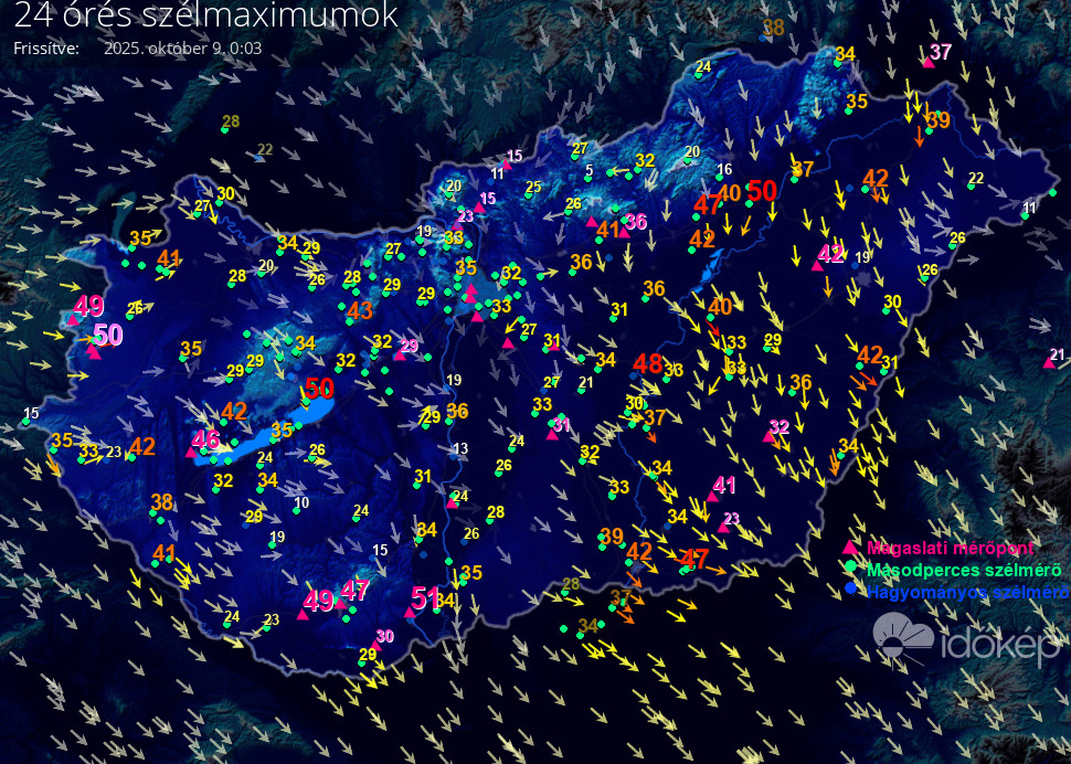 Térképünkön az elmúlt napon született legmagasabb szélerősség értéket jelenítjük meg.