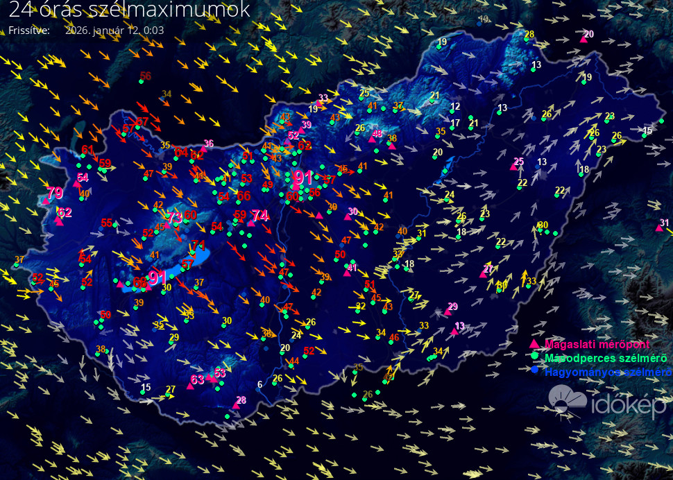 Térképünkön az elmúlt napon született legmagasabb szélerősség értéket jelenítjük meg.
